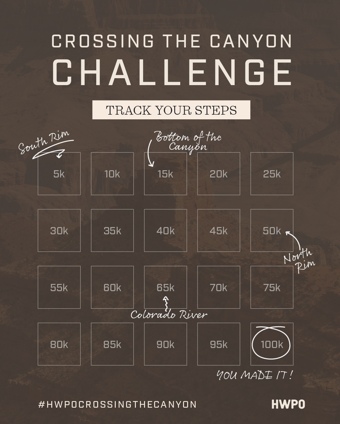 The Crossing the Canyon challenge starts May 1. Join HWPO MOVE and get the next 30 days of fitness for $1. Take on the challenge with the full community behind you.